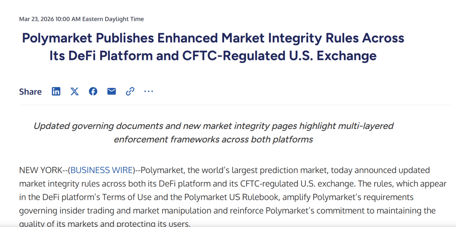 例如,Kalshi 已公开表示,将禁止政治候选人在与自身竞选相关的市场中交易,也将阻止职业和大学体育赛事中的运动员、教练、裁判等相关人员参与与自身赛事有关的交易;Polymarket 也在 3 月更新了市场诚信规则,明确禁止利用被窃取信息、非法获取的信息以及其他不当信息来源进行交易,并强化对市场操纵、信息滥用的约束。