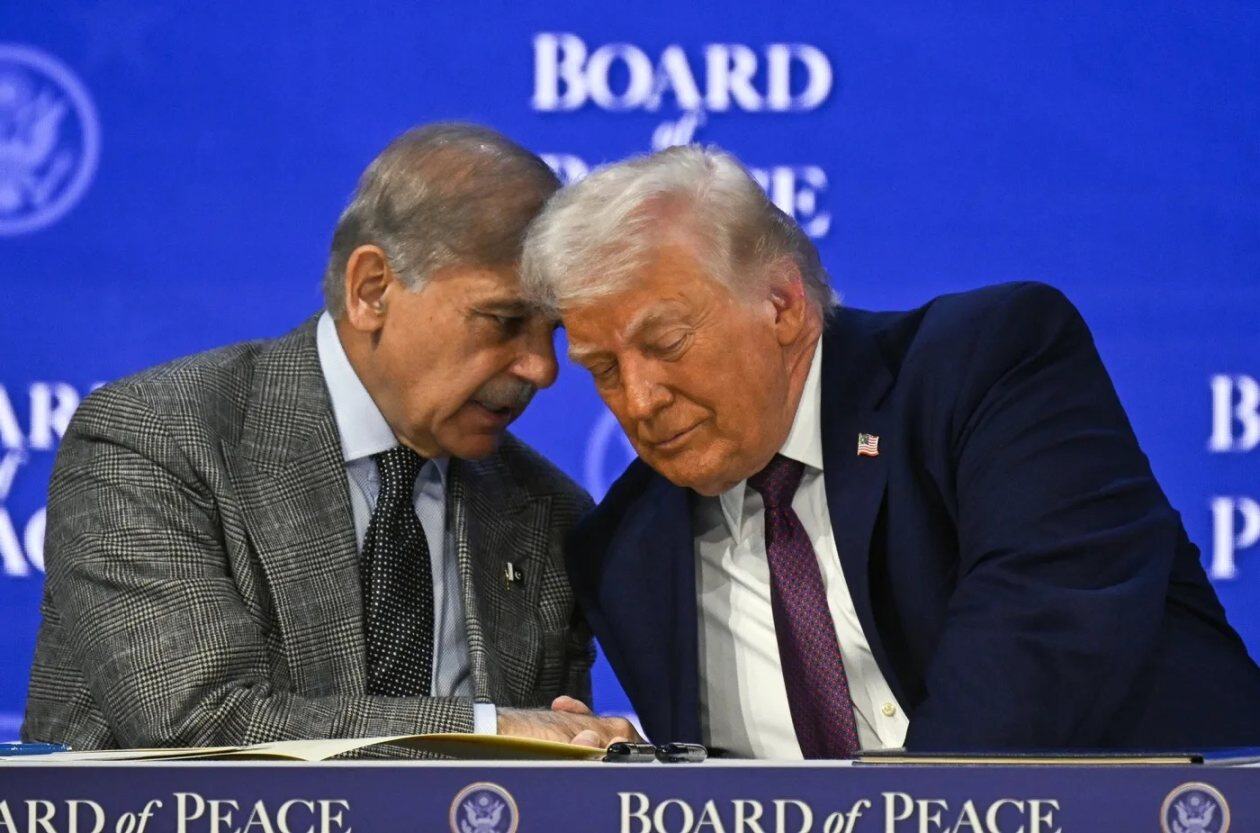 美国总统唐纳德·特朗普(右)与巴基斯坦总理 Shehbaz Sharif 出席 1 月 22 日在达沃斯举行的世界经济论坛期间召开的和平委员会会议。摄影师:哈伦·厄扎尔 / 阿纳多卢通讯社 / 盖蒂图片社