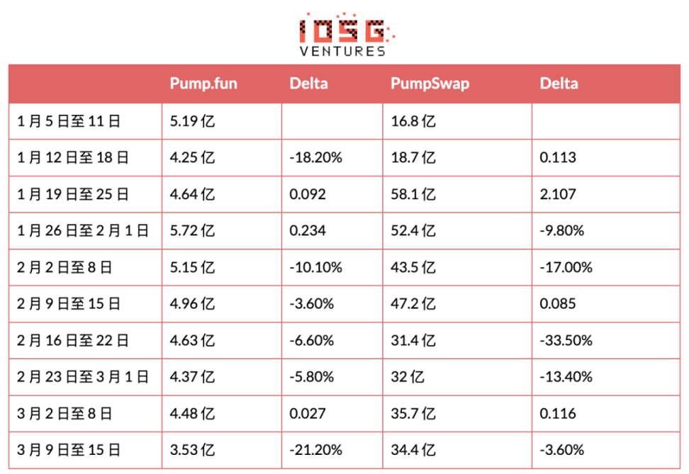 Launchpad 交易量很稳,8 周内在 4 亿到 5.7 亿美元之间波动(约 40% 幅度)。考虑到大量捆绑商和刷量用户在维持交易量底线,这不意外。