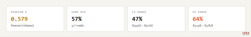 逻辑很简单:在自然市场中,Launchpad 和 PumpSwap 的交易量应该呈正相关且有时间滞后。Launchpad 活跃意味着真实投机兴趣高,一部分资金通过毕业机制流入 PumpSwap,支撑上市后交易。