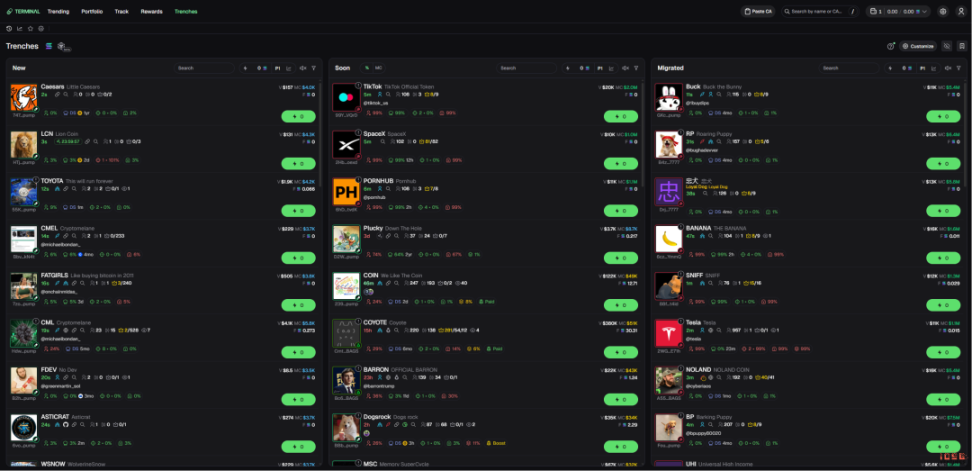 功能和同类终端类似:Trenches(查看新迁移 / 即将迁移的代币)、自定义界面、抢购和即时买入、多钱包策略、捆绑检测器。