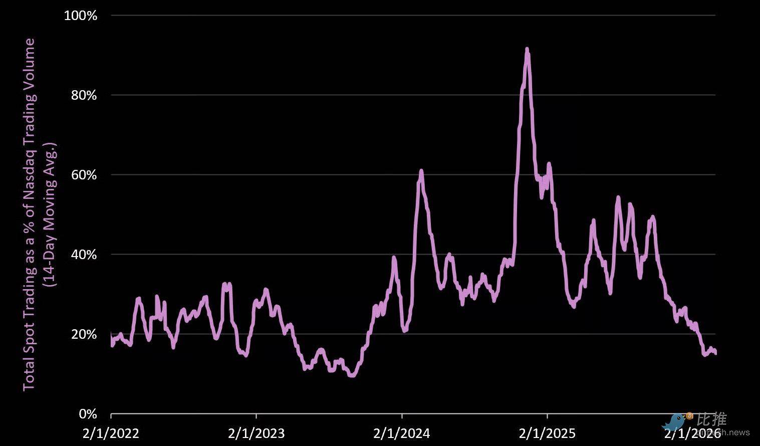 上一周期中被报道较少的事件之一是,在去年 1 月的「模因币狂热」期间,加密货币的成交量一度让纳斯达克感受到了压力——当时加密成交量增长了近 3 倍,达到每日 900 亿美元(占当时纳斯达克成交量的 90%)。