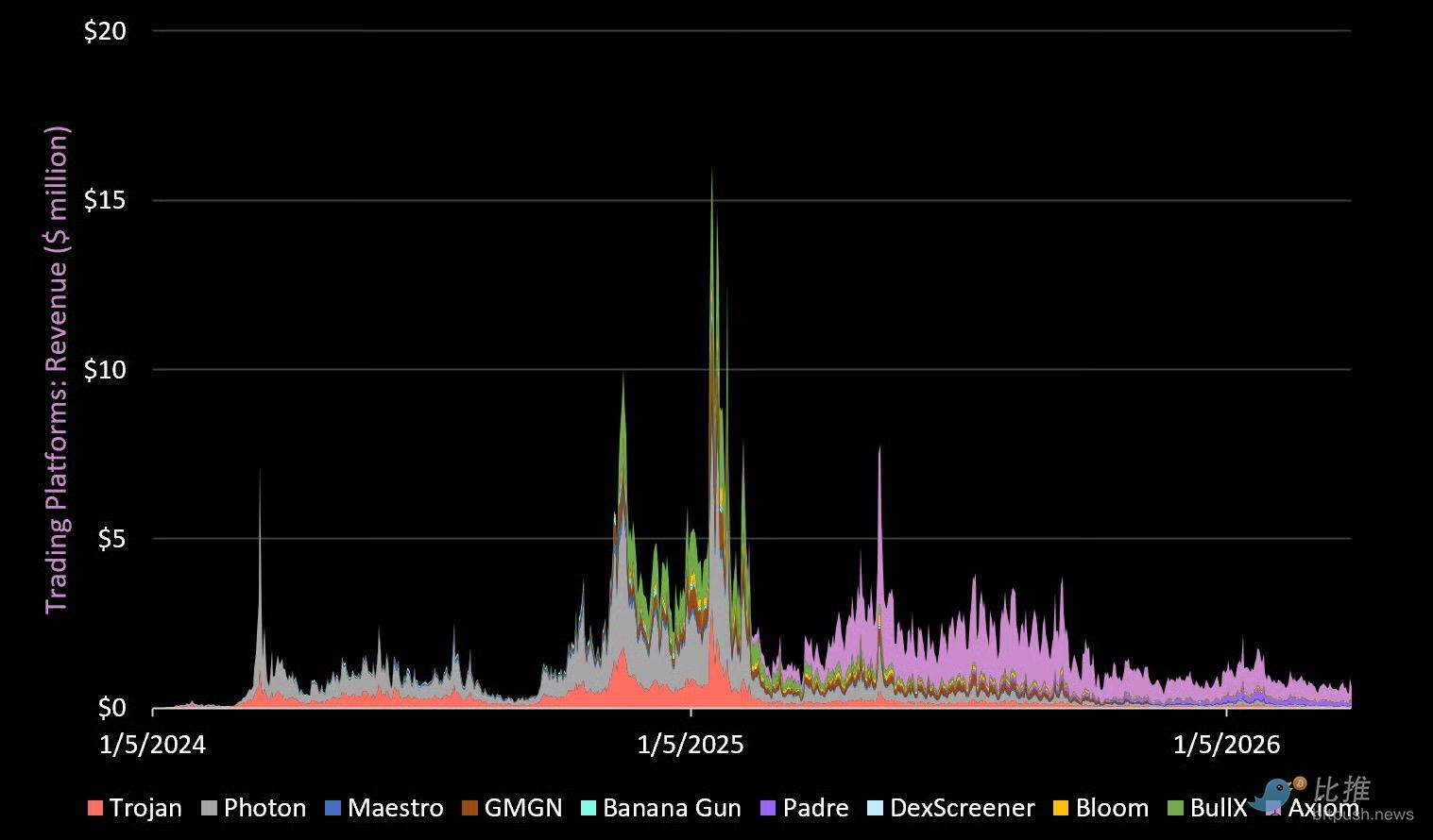 - 交易机器人 / 应用是上一周期最成功的应用之一。曾几何时,它们每天产生的收入超过 1000 万美元。目前总收入已较 2025 年初的峰值下降了 94%。