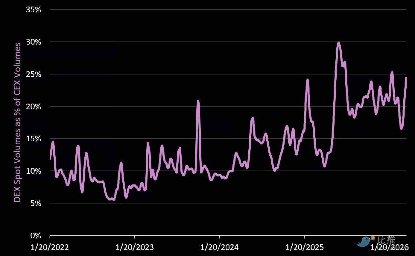 - DEX 永续合约成交量目前占 CEX 永续合约量的 9.3%,高于 2025 年初的 4%。