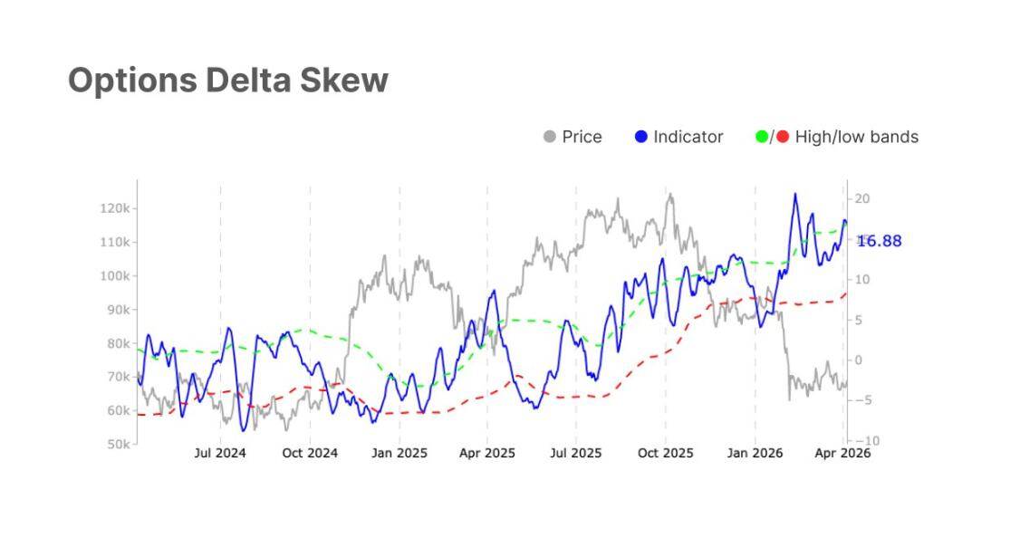 但链上基本面的恢复仍然滞后,已实现市值变化从 -0.6% 进一步降至 -0.7%,意味着新资金尚未大规模回流;Hot Capital Share 从 21.0% 降至 20.1%,短期投机性资金持续流失;25-Delta 偏斜升至 16.88%,期权市场对下行风险的定价并未因价格反弹而消退。