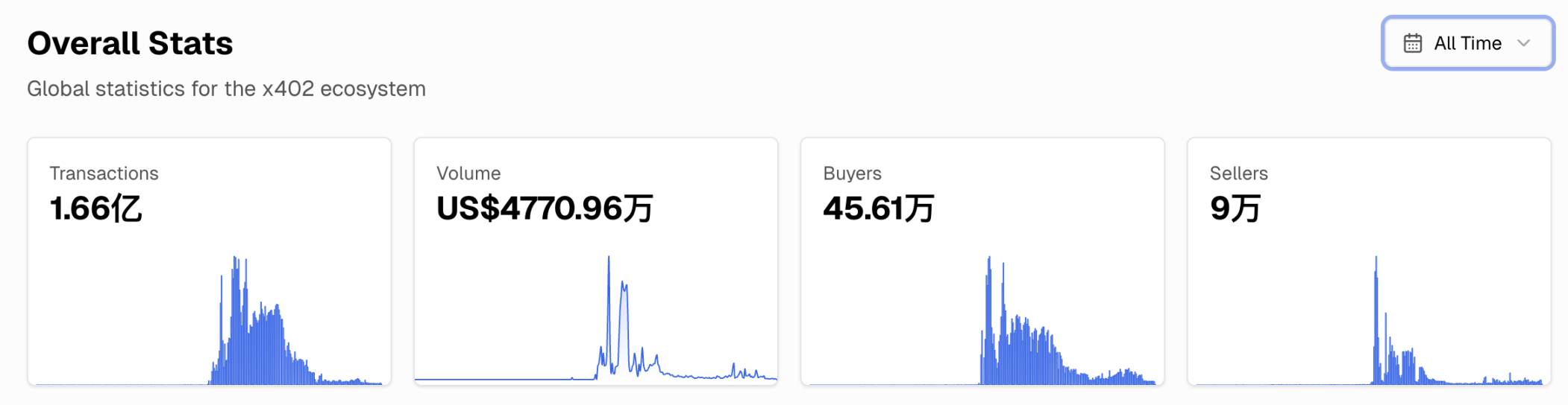 链上数据更能直观反映生态的冷却。x402 上的日交易笔数从 2025 年 11 月高峰时的约 380 万笔,萎缩到如今的几万笔;日交易量从 200 多万美元回落至最近的一两万美元。