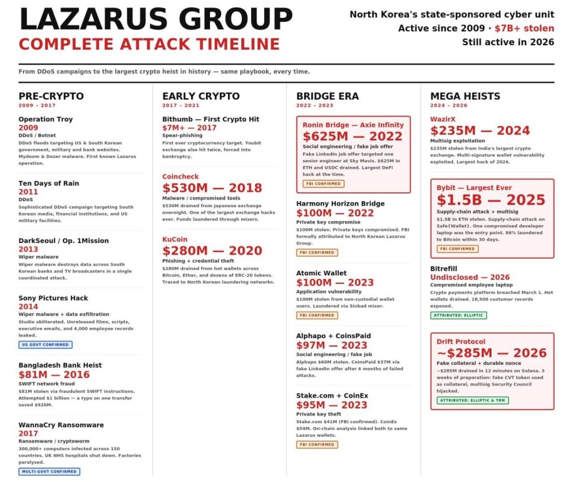 该组织制造了多起轰动全球的攻击事件:2014 年索尼影视娱乐遭破坏,2016 年孟加拉国央行被盗 8100 万美元,2017 年 WannaCry 勒索病毒肆虐全球,2022 年 Ronin Bridge 和 Harmony Horizon Bridge 分别失窃 6.2 亿和 1 亿美元,2023 年 Atomic Wallet 和 Stake 相继被攻击。2024 年 10 月,UNC4736 攻击 Radiant Capital 窃取 5000 万美元;2025 年 2 月,TraderTraitor 从 Bybit 盗走创纪录的 15 亿美元;2026 年 4 月,完成对 Drift Protocol 的 2.85 亿美元攻击。