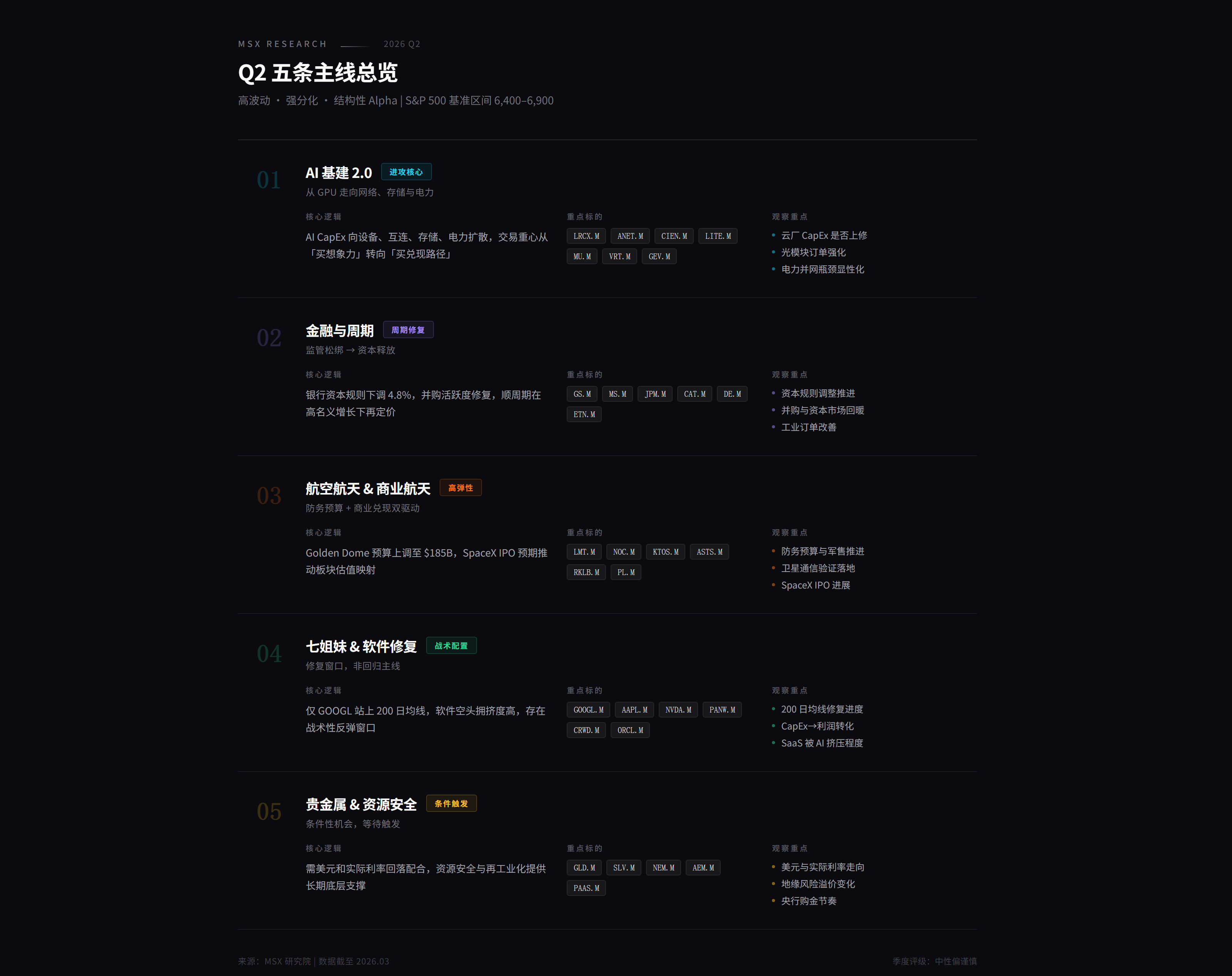 也就是说,Q2 最合理的打法,并不是把所有筹码都压在高弹性科技票上,也不是因为担心波动就全面退守,而是「带防守去打进攻」,核心仓位依然可以围绕 AI 基建、航空航天链条展开,因为它仍然是当前订单、收入和产业传导最清晰的主线;与此同时,也需要保留一部分与科技周期低相关的敞口,比如金融、软件、贵金属与资源安全,来提升组合的韧性与应对突发事件的能力。