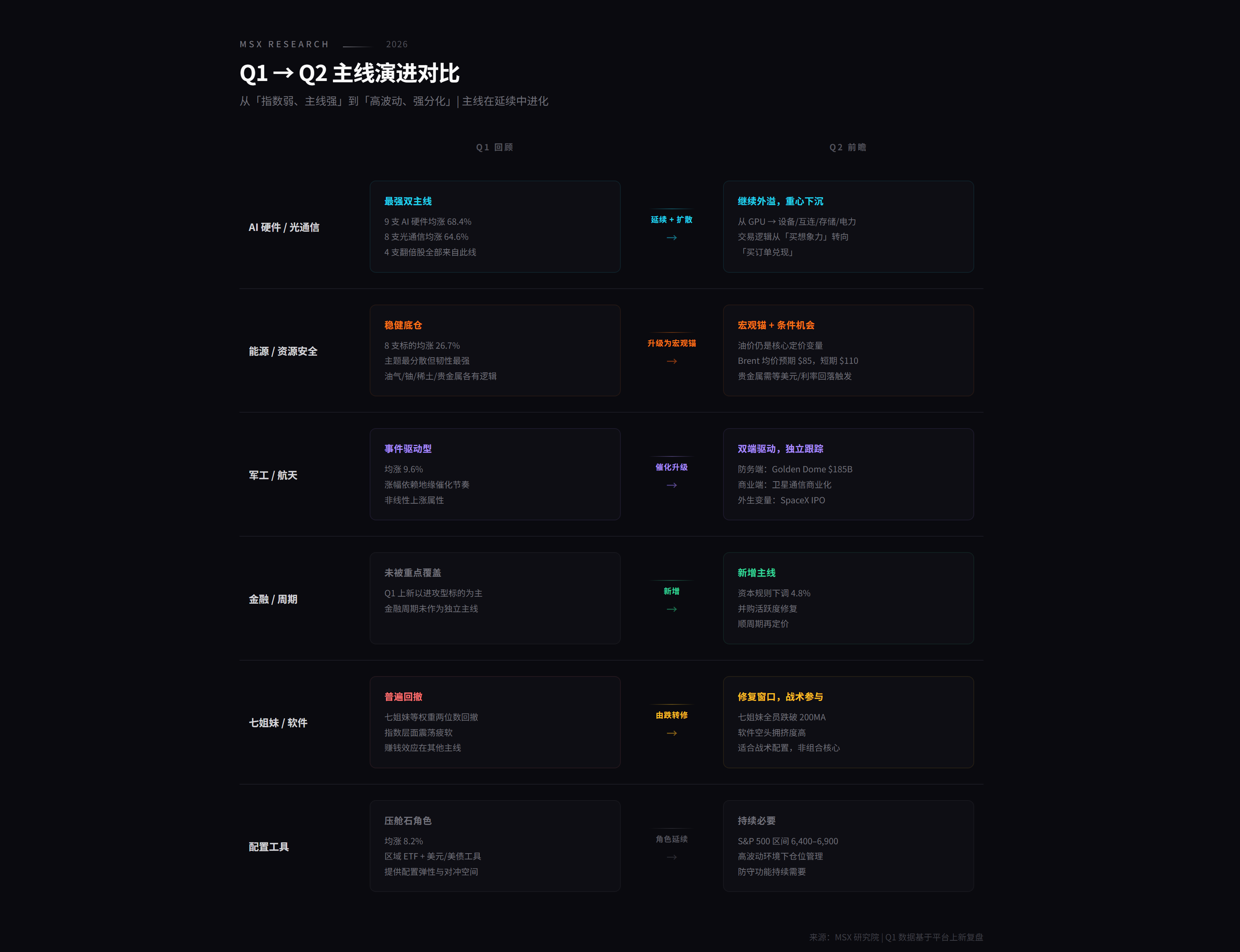如果把当前环境概括为「高油价 + 高利率 + 指数难有趋势性上行」,那么 Q2 的超额收益,大概率仍然来自少数几条清晰主线。