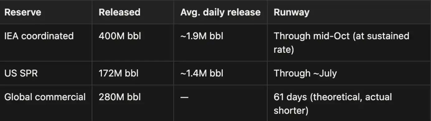 这些数字本身也存在问题:战略石油储备(SPR)的释放有物理上限,历史上大约是 200 万桶/日。也就是说,真正能够填补缺口的能力,远低于纸面上的 headline 数字。