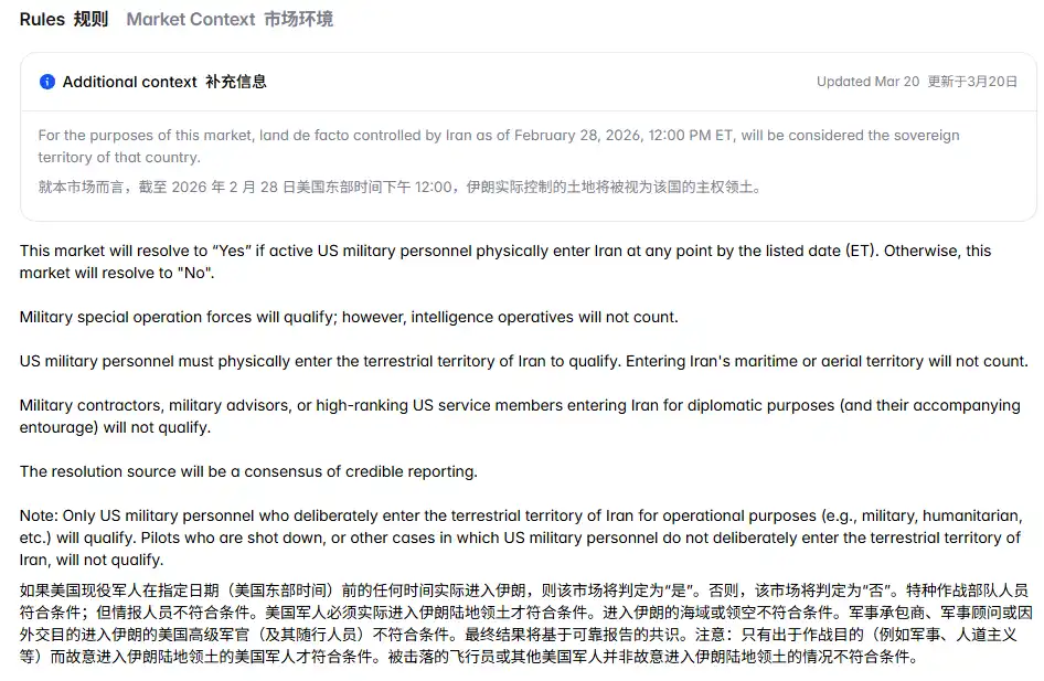由于,美军进入伊朗领土某种程度上也算美军入侵伊朗,直接影响了 Polymarket 平台上美军何时入侵伊朗的预测事件(US forces enter Iran by?)