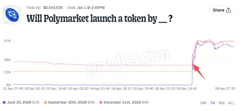 1、Polymarket 将在何时发币(Will Polymarket launch a token by ___ ?)。
