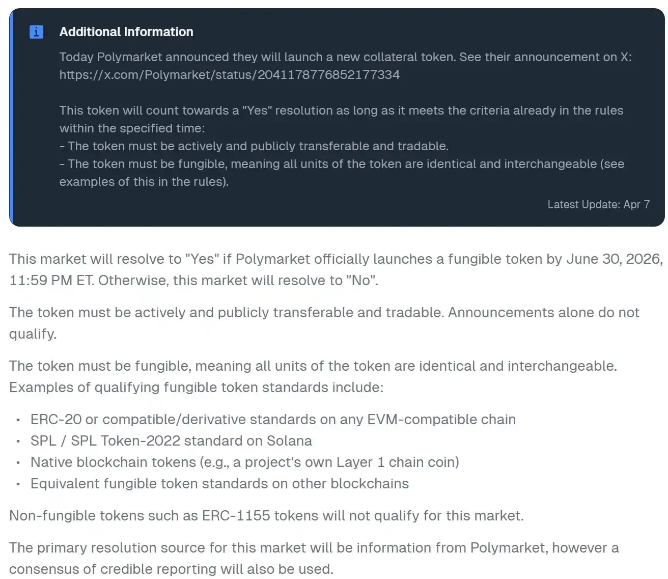 支持方认为,从规则字面来看,「发行代币」并未被限定为必须是「治理代币」(governance token),而是对所有代币的泛指。在这一前提下,Polymarket USD 作为由 Polymarket 发行的 ERC20/SPL 等同质化代币,本质上符合「发币」的定义。此外,官方后续补充说明更多是对原有规则的重申,而非临时修改规则,因此在合规性上具备一定合理性。