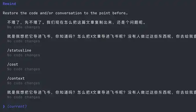 你可以使用这个功能,回到任意一个检查点,避免 Claude code 将代码搞乱。
