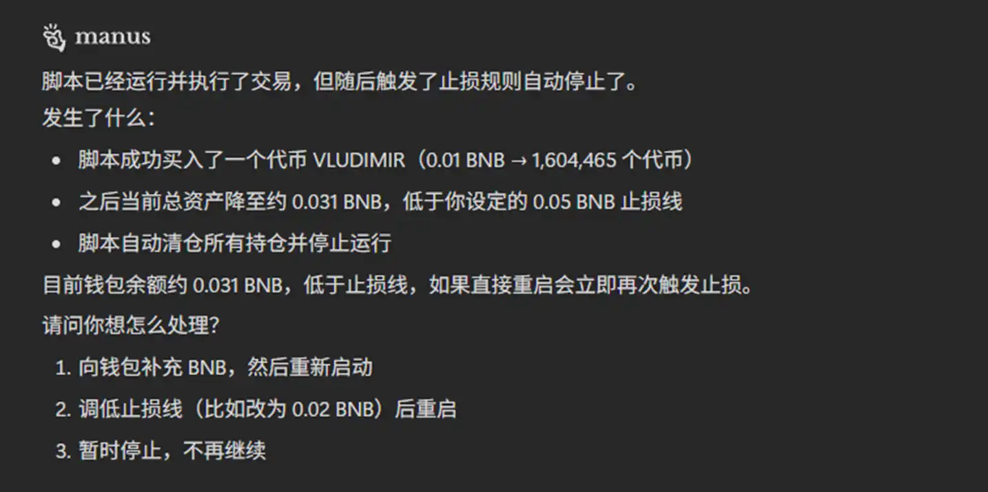 笔者的这个策略过于简单,有很多的漏洞,于是很快触发了止损,Agent 也根据要求停止了交易: