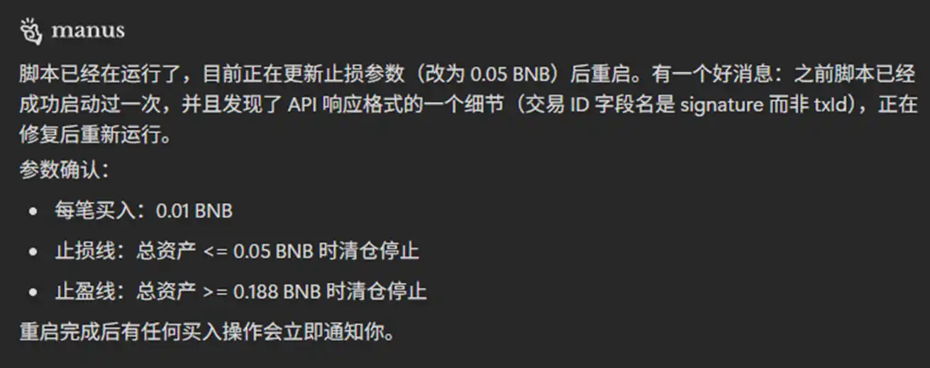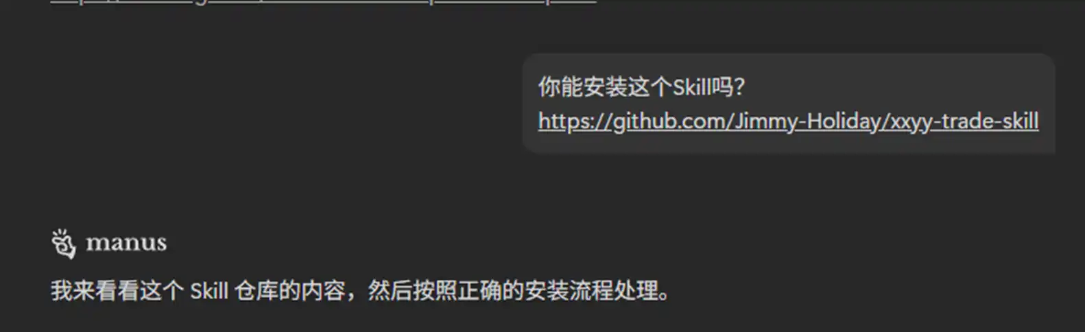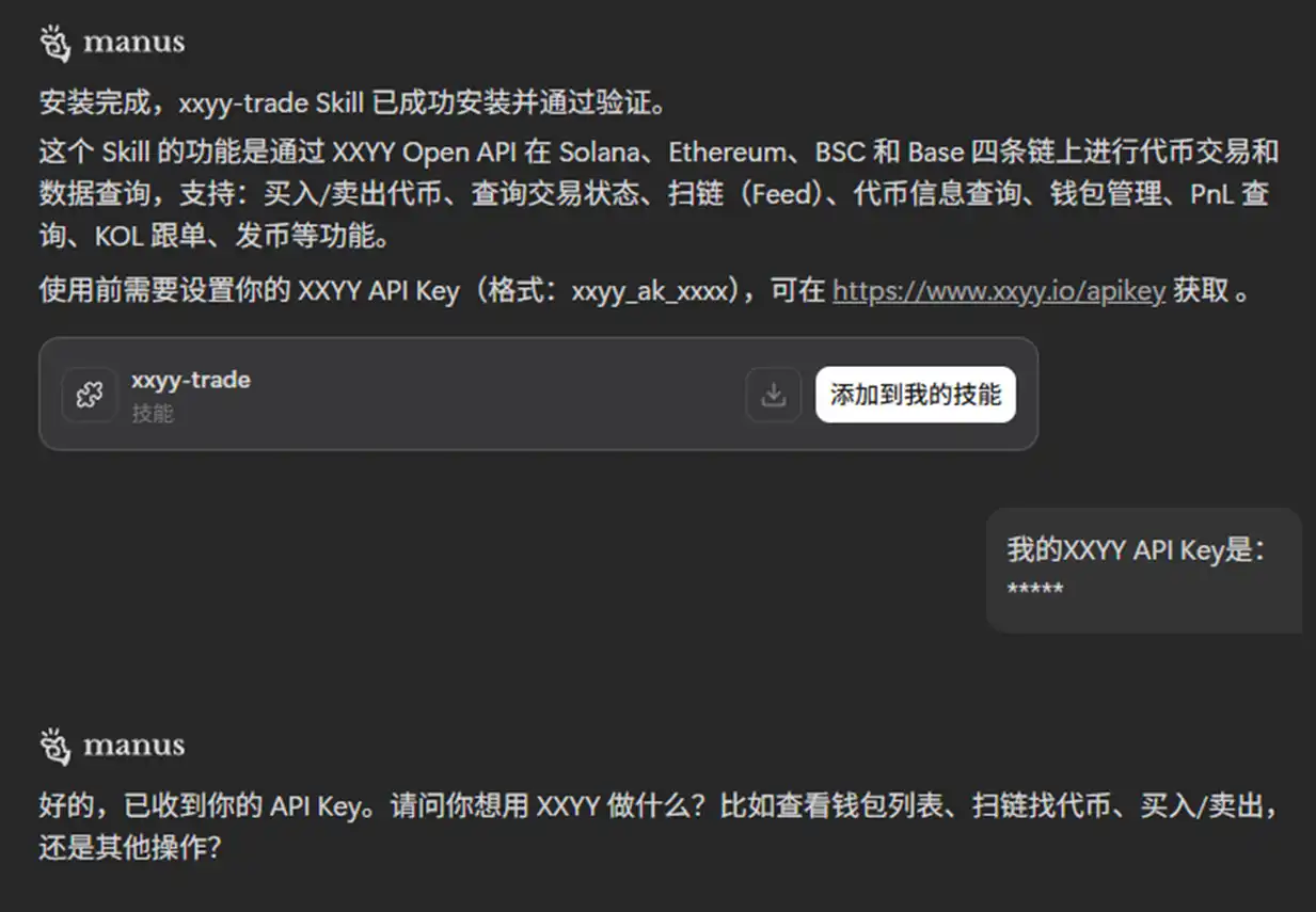 如果觉得 OpenClaw 有可能导致资产安全问题,或是在使用 Claude Code 的过程中账号被封禁,用 Manus 或其它能够提供通用 Agent 的 AI 应用也可以。安装 XXYY Trade Skill 非常简单,比如笔者就只是简单地把这个 Skill 的 Github 链接发送给了 Manus 并让它自己来进行安装配置,一切就搞定了。