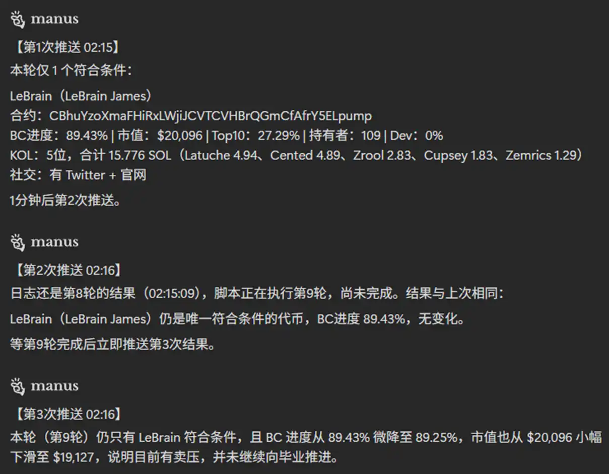为了避免消耗过多 token,我们设定运行时长为 3 分钟,每分钟对扫链结果进行 1 次推送,这个要求得到了正常运行: