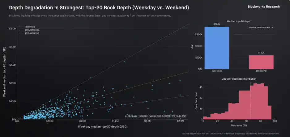 起初来看,周末的流动性似乎明显下降——所有市场的中位流动性整体下滑了约 66.1%。但与此同时,那些贡献主要成交量的头部市场,其流动性却基本维持在与工作日相近的水平。