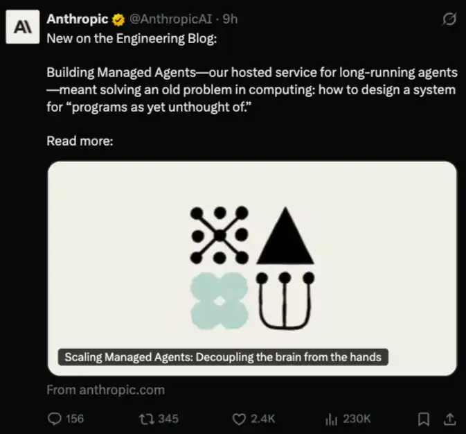 Anthropic 工程团队写了一篇技术博客 Scaling Managed Agents: Decoupling the brain from the hands,讲了 Managed Agents 背后的架构演进。