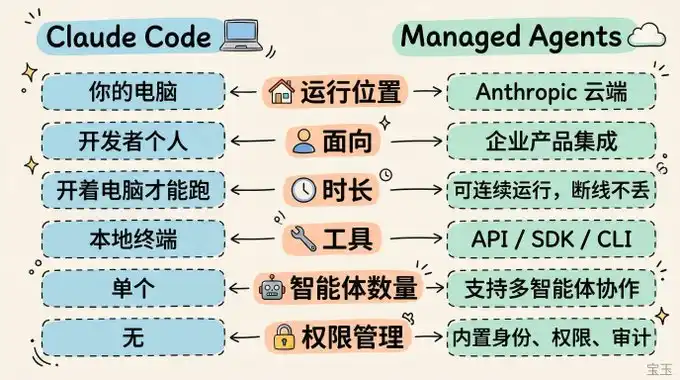 Managed Agents 跑在 Anthropic 的云上,是给企业用的 API 服务。它可以 24 小时不间断运行,断线了也不丢进度,你的产品可以直接内嵌智能体能力。