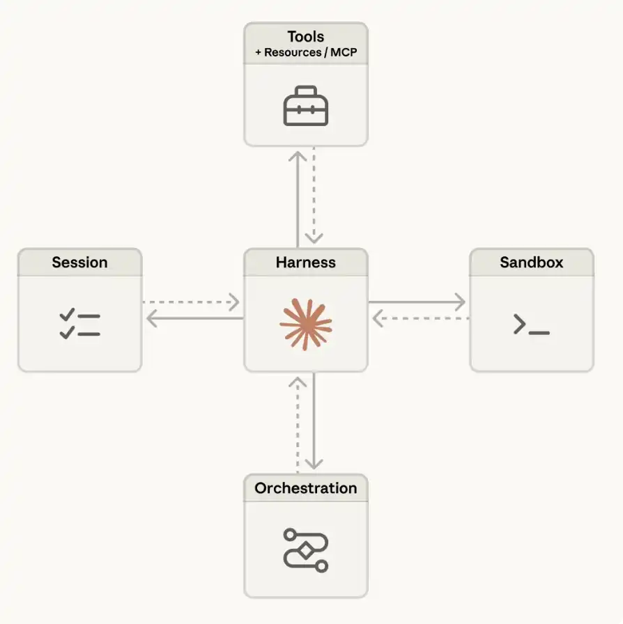基于这一思路,我们并没有去设计一种固定的 agent 运行框架(harness),因为我们预期它会持续演进。相反,我们将系统中的几个关键部分进行了「解耦」:
