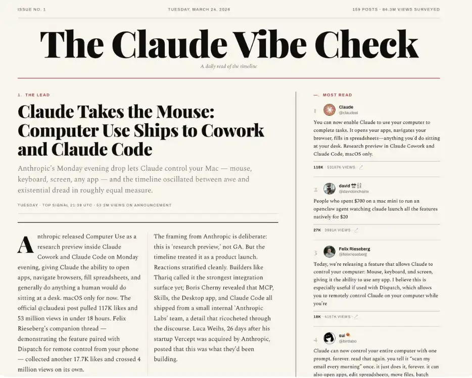 例如,我和很多人都会用这种方式生成每日简报(比如 X 平台或 GitHub 的动态汇总,或者一个智能体团队的工作进展)。下面是我日常使用的一个 X 活动每日简报示例。
