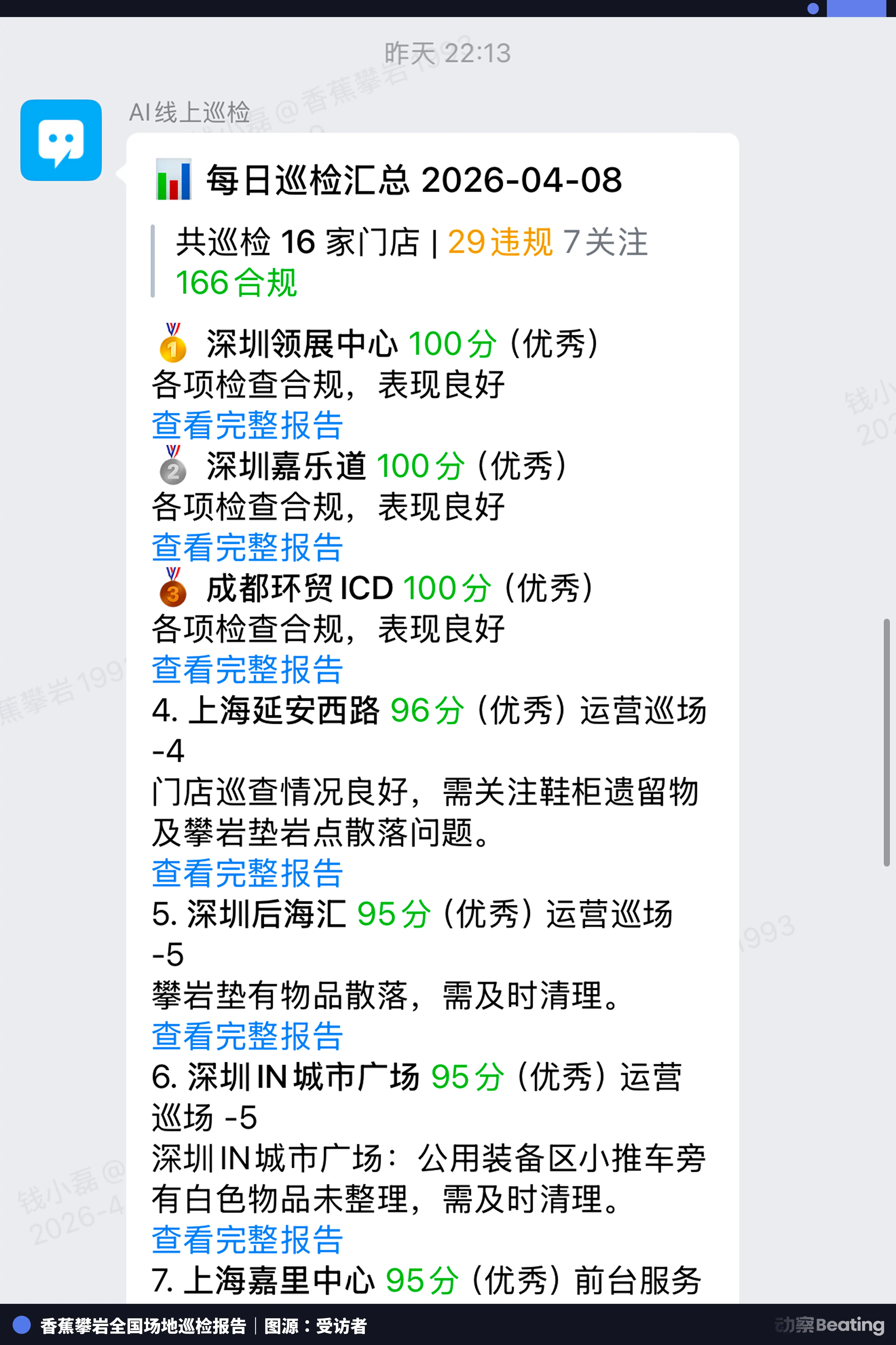系统可以一键启动全国 7 个城市 21 家门店的巡检。监控截屏,AI 分析画面,生成报告。