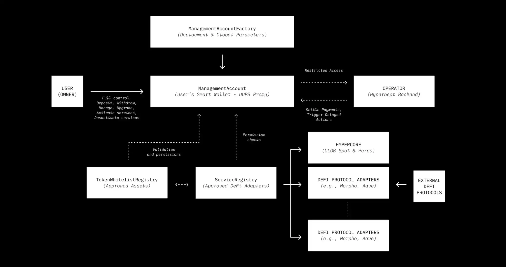 与所有中心化加密卡不同,用户资产始终留在自己控制的 ManagementAccount 智能钱包中。Hyperbeat 后端仅拥有受限的 Operator 角色,只能在用户设定额度内执行结算,无法转移资产到未授权地址。
