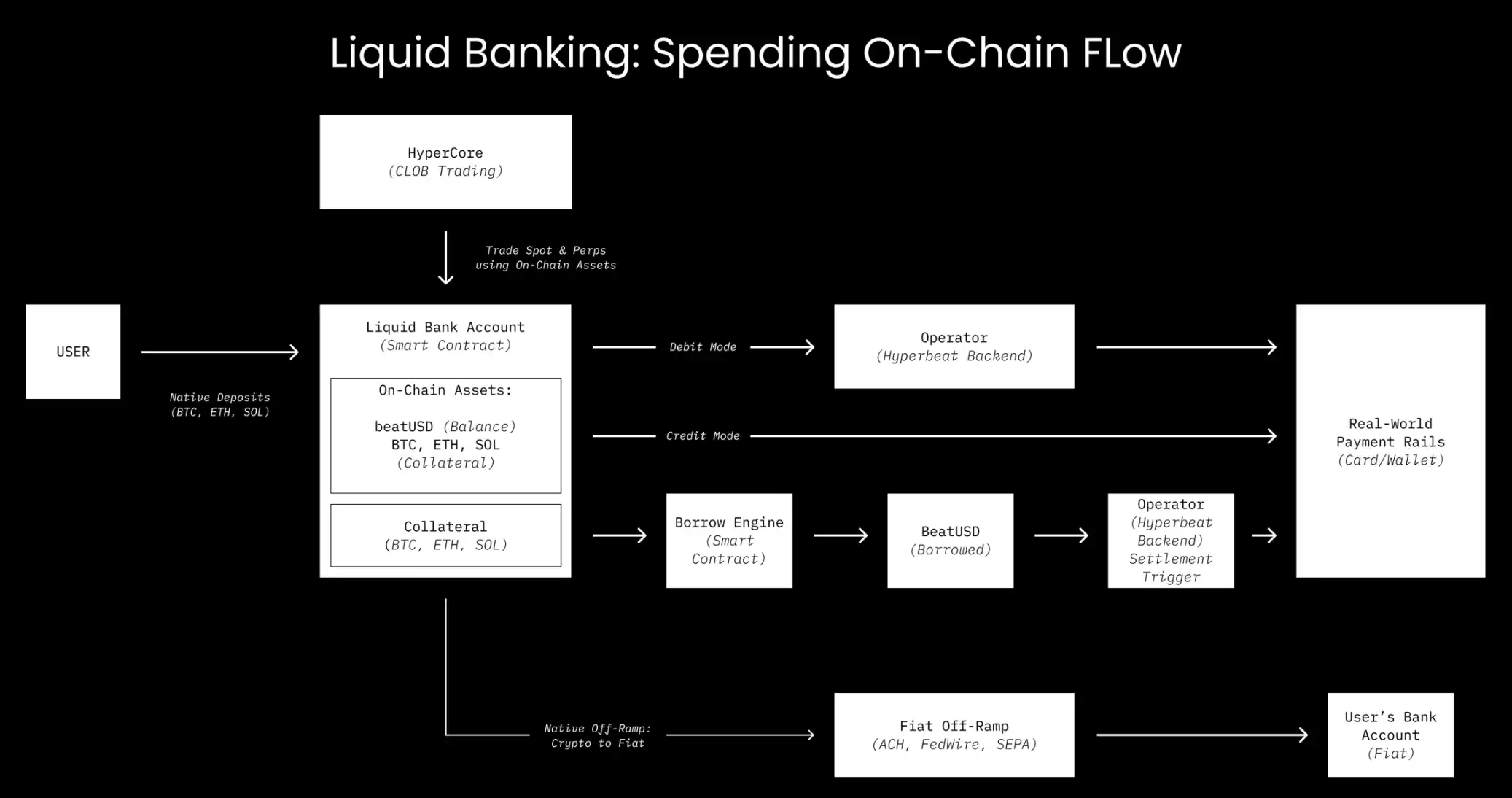 4 月 8 日,Hyperliquid 原生协议 Hyperbeat 上线 Liquid Banking,部署在 HyperEVM 上的自托管「银行」,将稳定币存款、VISA 卡消费、永续合约交易和多币种法币出入金整合进同一个链上智能钱包。