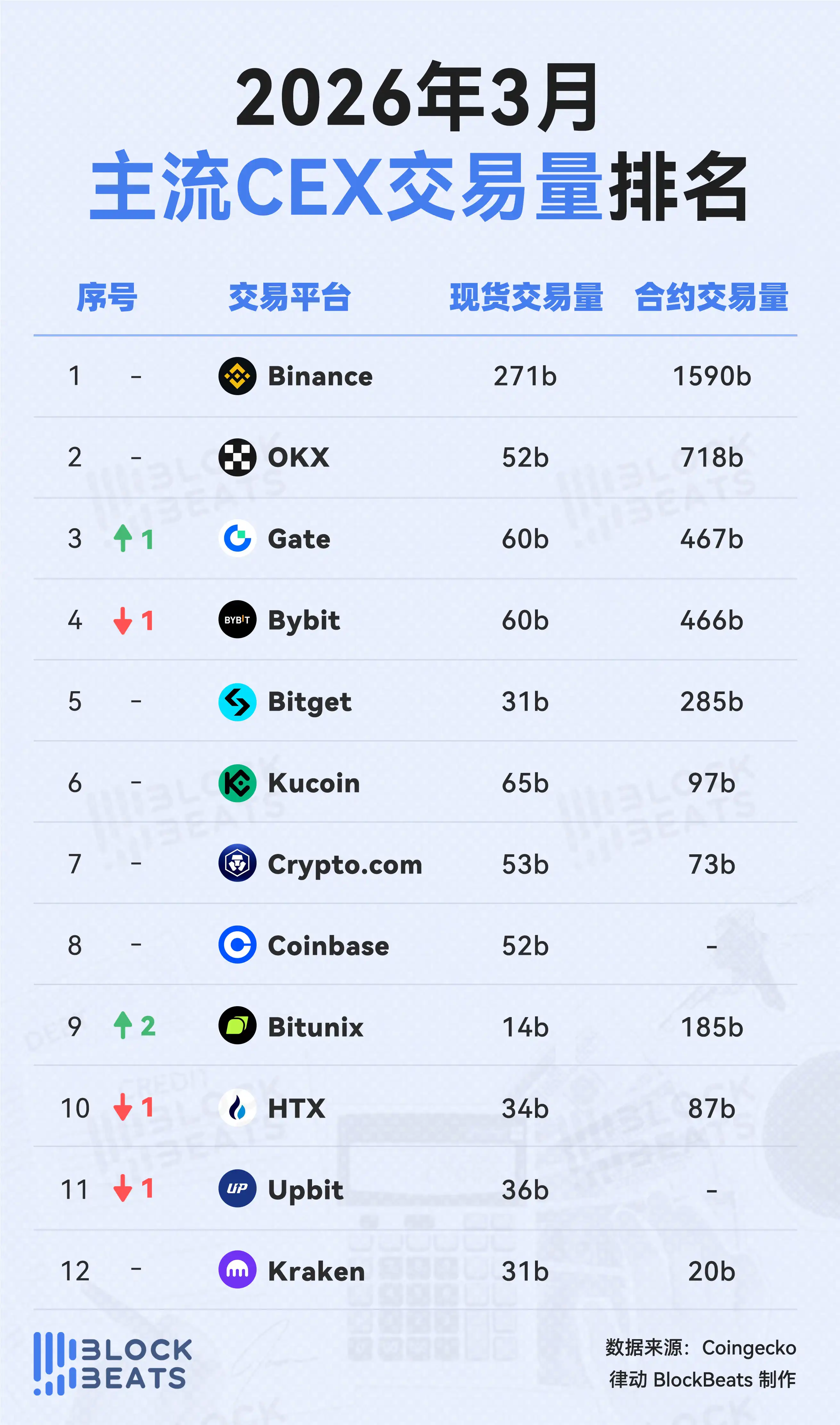 2026 年 3 月主流 CEX 的现货交易量相较 2026 年 2 月下降 21.35%,永续合约交易量相较 2026 年 2 月下降 6.14%。