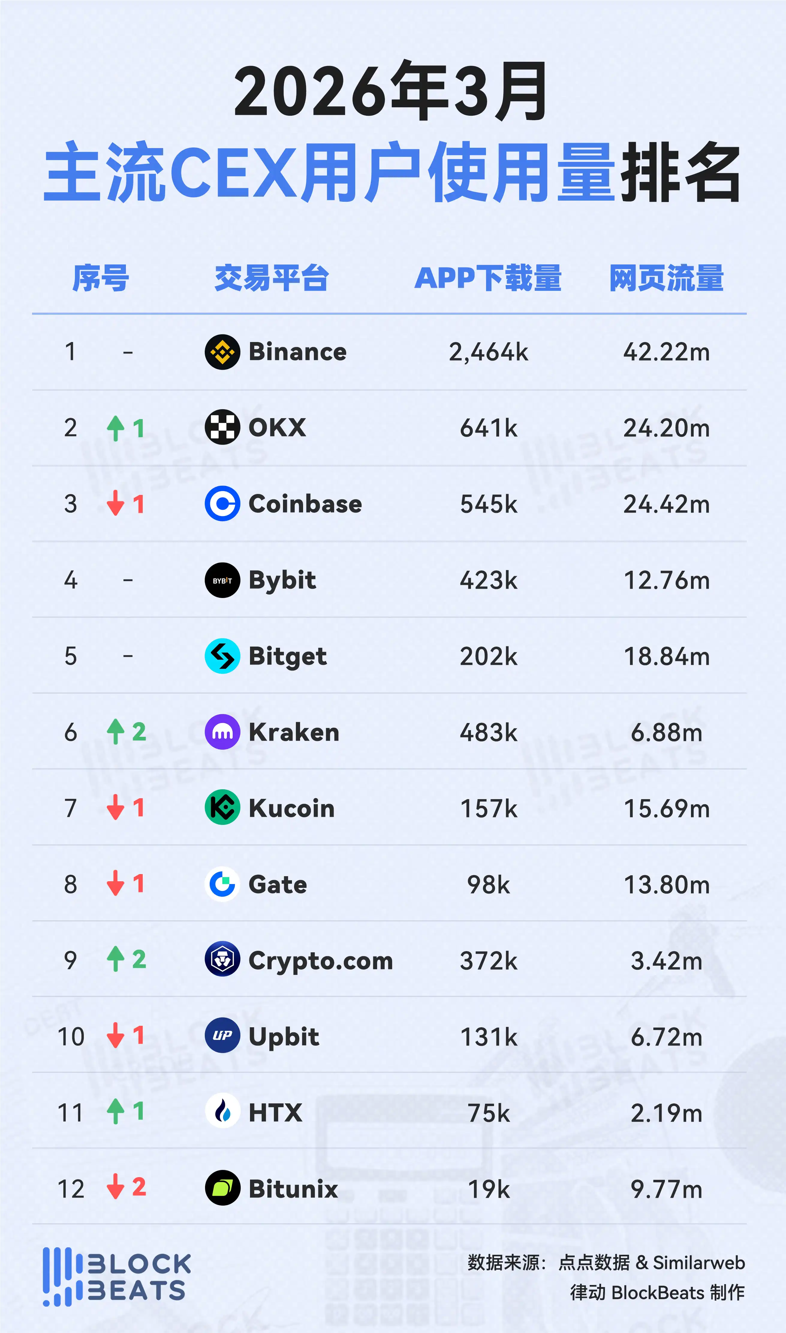 3 月主流 CEX 的网站浏览量相较 2026 年 2 月下降 0.89%,2 月主流 CEX 的网站下载量相较 2026 年 2 月上升 5.53%。