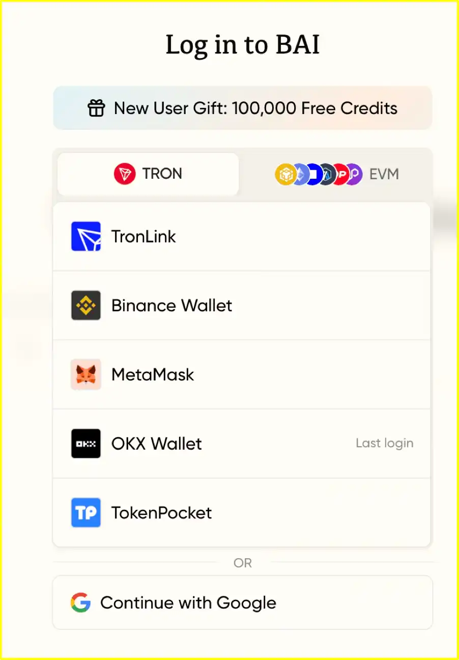 目前,B.AI 已支持波场 TRON 以及 BNB Chain、Ethereum 等 EVM 网络,用户可通过 TronLink、MetaMask 等钱包登录。