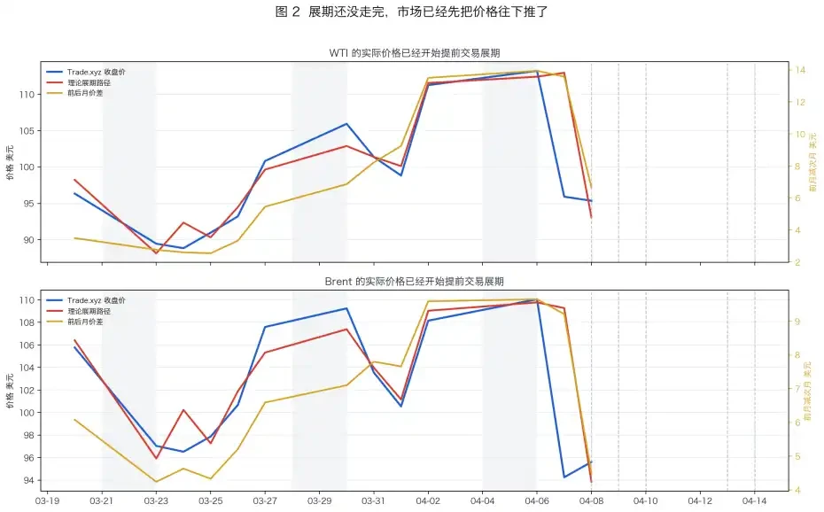 在「现货溢价」的背景下,这意味着 Tradexyz 上的预言机价格将在 5 个交易日内从近月价格跌至远月价格。