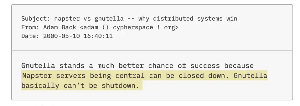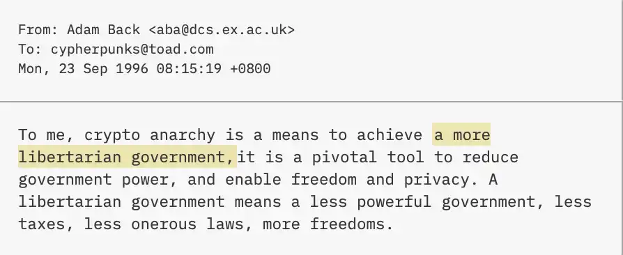 和许多这些「笔友」一样,Back 信奉「加密无政府主义」(crypto anarchy)——一种主张通过密码学手段,将个人生活从国家权力干预中隔离出来的理念。