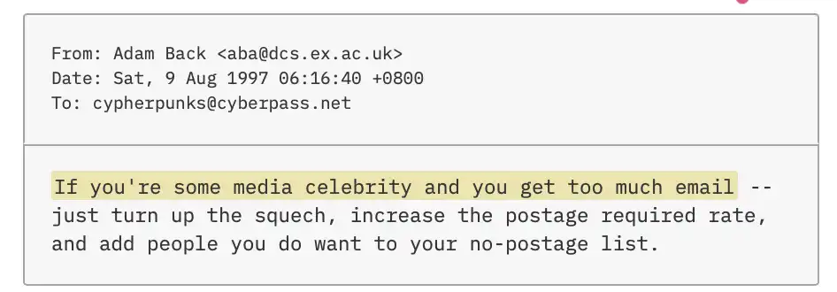 如果脑子里没有长期被「垃圾邮件问题」占据,很难把这种用途视为中本聪这种新型电子货币的一个自然应用场景——而这恰恰是 Adam Back 十多年来一直在思考的问题。