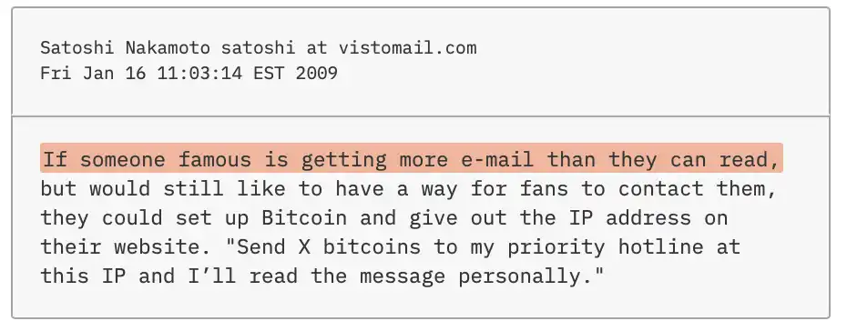 在推出 Hashcash 五个月后,Back 曾在 Cypherpunks 邮件列表上提出,这一机制或许可以帮助名人筛选邮件。而在 2009 年 1 月发表于 Cryptography 邮件列表的一篇帖子中,中本聪也提出了类似的设想——只是这一次,他用的是比特币。