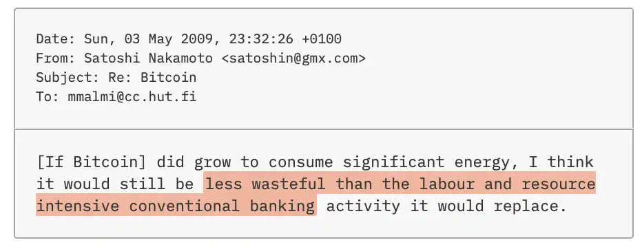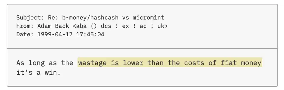 这一观点当时并未引起太多关注,垃圾邮件依旧泛滥。但四年后,Back 在 Bitcointalk 上几乎提出了完全相同的看法:「如果基于 Hashcash 的 CPU/GPU 挖矿比发送垃圾邮件更赚钱,也许垃圾邮件甚至会减少。我觉得这种情况很可能发生。」