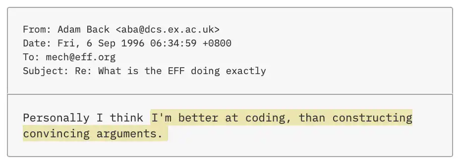 在他最早的一些发帖中,Adam Back 曾解出一道密码学挑战题——一种类似数学谜题的任务。这道题是由来自加州的密码朋克 Hal Finney 发布的,他曾参与 PGP 的开发。这也标志着两人线上友谊的开始:几十年后,Back 在社交平台上回忆,他们在邮件列表内外有过多次互动,他也一直欣赏 Finney 的专注力与编程能力。