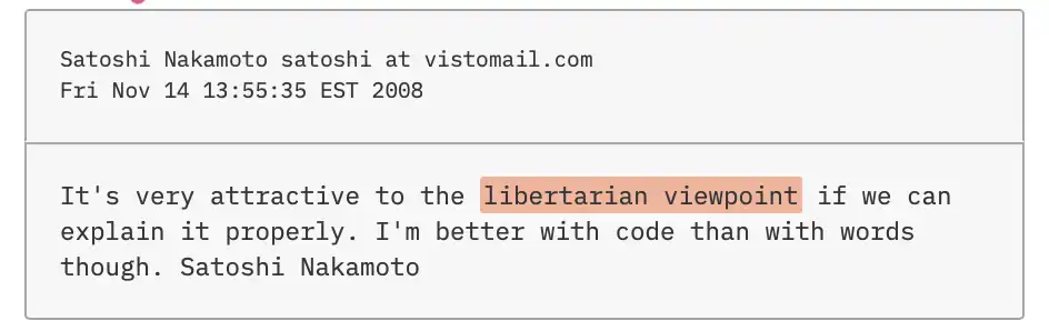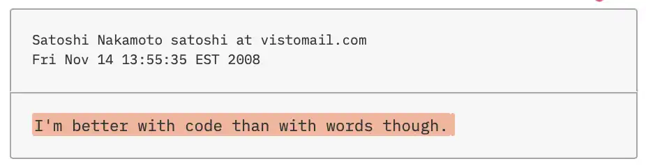 当中本聪曾向 Hal Finney 解释,如果能把比特币讲清楚,自由意志主义者会很容易接受时,他补充了一句:「我在代码方面比在表达上更擅长。」(Better with code than with words)