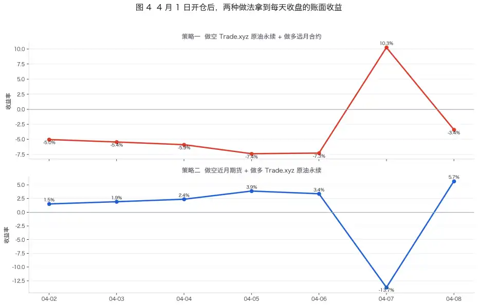 假设在 4 月 8 日以 95.352 美元做空 Trade.xyz 的 WTI 合约,同时以 87.75 美元做多 6 月的期货合约,各配 10,000 美元名义本金。如果两边最终收敛,理论上能拿到 7.60 美元的差价,约合 797 美元的收益。但 4 月 8 日空头单日资金费率已经到了 1.42%。按剩余 6 天展期完成推算,资金费要付掉 851 美元。这笔账算到这里,净利润已经只剩 -53 美元。这还没算上交易手续费和滑点。