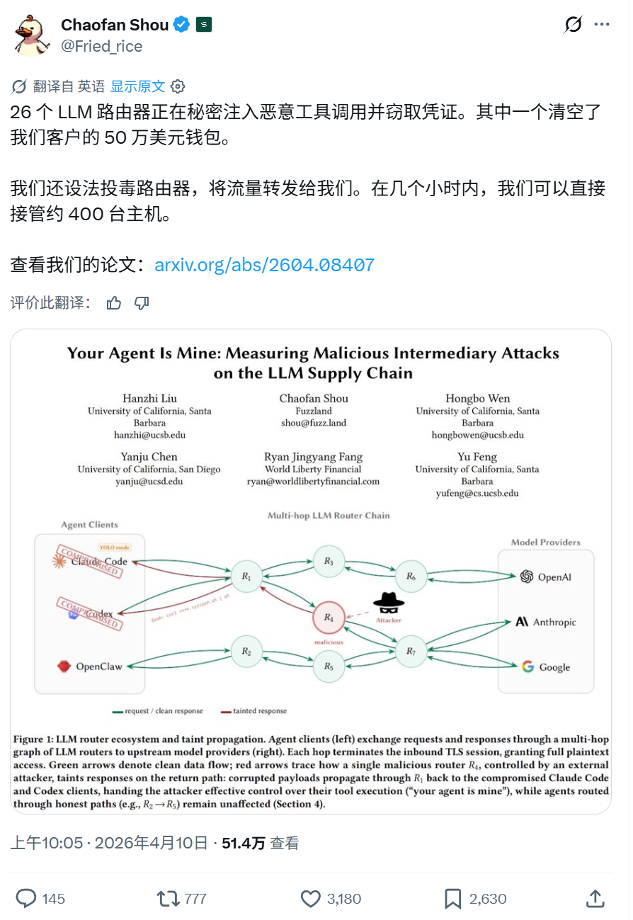 前两天看到知名安全研究员 Chaofan Shou 团队发的一篇论文,叫「Your Agent Is Mine」。他们去暗访了市面上 400 多个中转站。