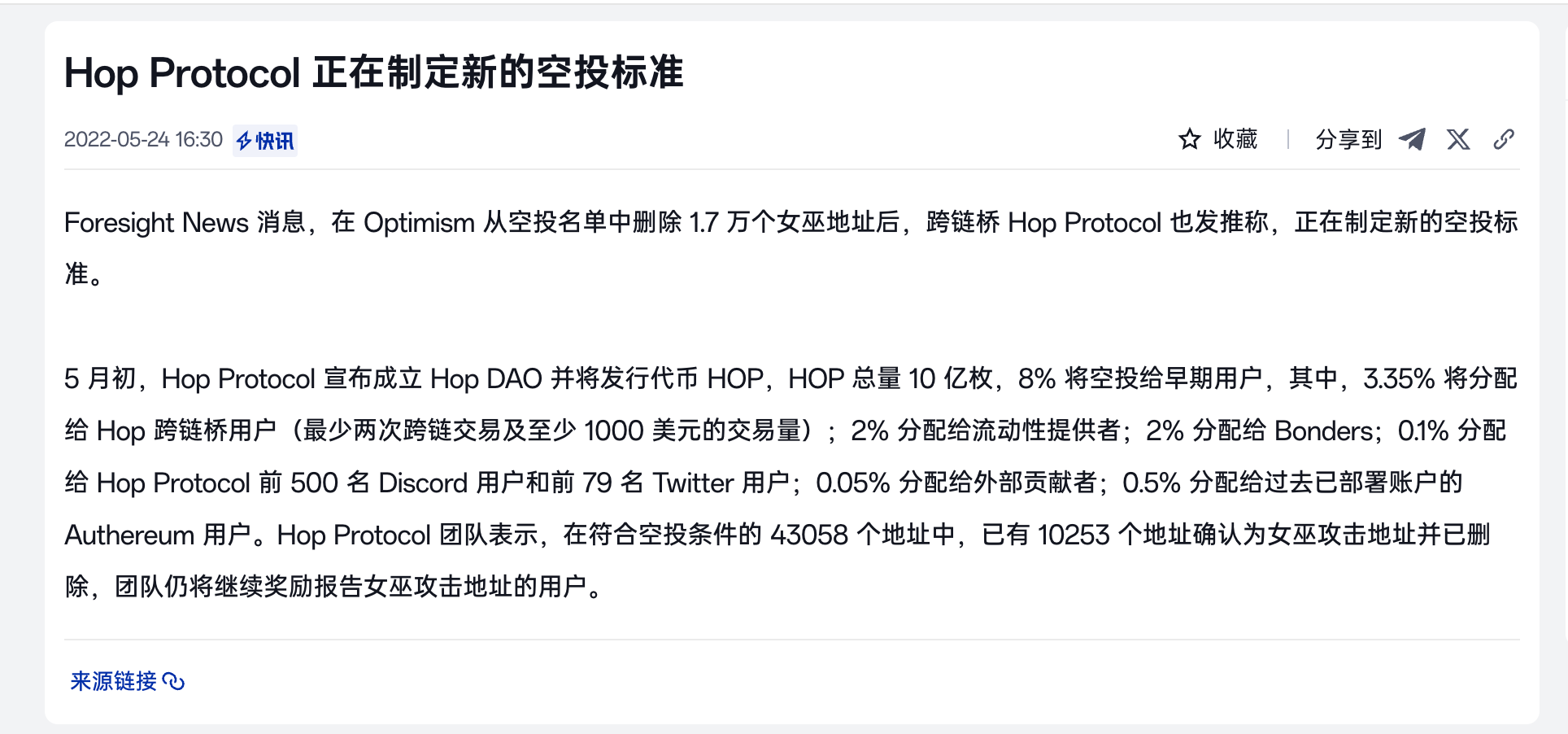 - 深远影响: HOP 之后,查女巫成了所有发币项目的「政治正确」,链上交互从「体验去中心化产品」变成了极致内耗的猫鼠游戏。打击女巫本身有其必要性,但把审查责任完全甩给社区、甚至鼓励互害的做法,严重破坏了社区生态。