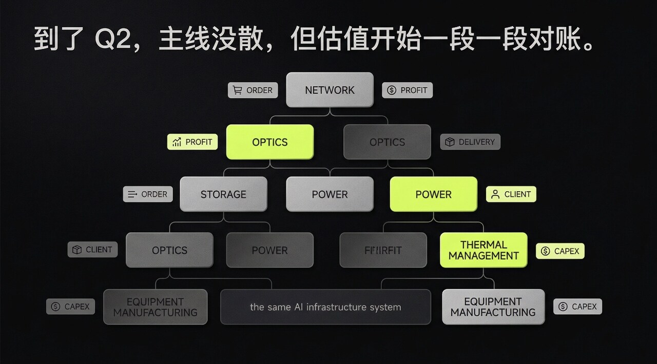 Q1 先涨的是整条链,到了 Q2,盘面就会开始一段一段对账,网络、光、存储、电力、设备制造,后面不会再一起走,谁的订单先落地,谁的交付先跟上,谁的利润先做出来,谁就更容易把估值站住。