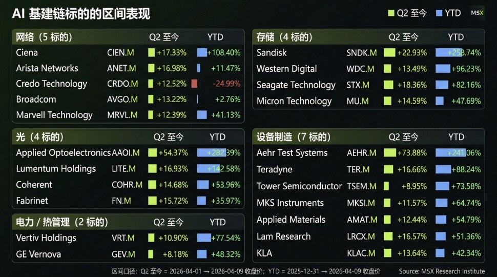 从区间表现看,Q2 以来弹性最强的是 AEHR.M 和 AAOI.M;YTD 维度上,AAOI.M、SNDK.M、AEHR.M、LITE.M 的涨幅更靠前,也更能直观看出 AI 基建链内部已经走出了明显分化。
