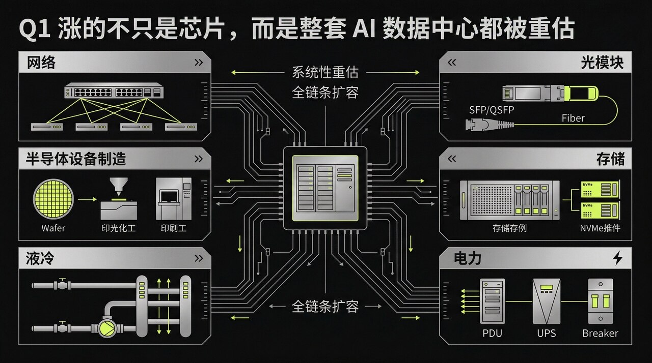 所以 Q1 的涨法,不是一两家公司单独冲,而是整条链被一起抬上来。市场先认定了一件事,数据中心要扩容。后面的网络、光、存储、电力、热管理、设备制造,就都被摆上桌了。