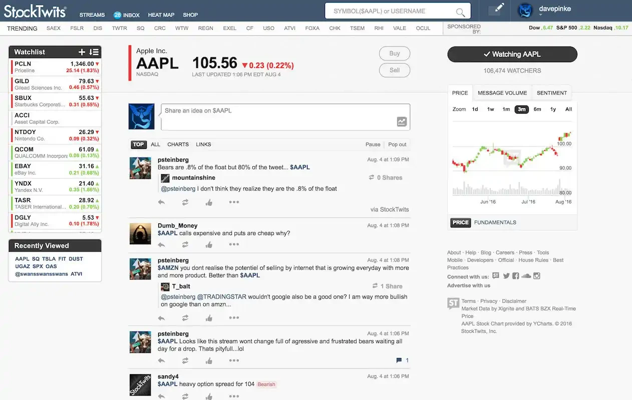 接下来的十几年,两者形成了一种奇怪的平衡,StockTwits 靠 cashtag 活着,但流量远不及 Twitter。Twitter 有了 cashtag 这个功能,但它在 Twitter 上更像一个标签,而不是一个真正的金融工具,点进去只有话题页,没有数据,没有价格,没有任何可以行动的东西。