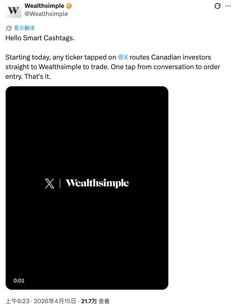4 月 14 日,X 平台在美国和加拿大的 iPhone 端上线了 Cashtag 功能。用法很简单:在推文里打 $AAPL,这串字符就变成了蓝色的可点击链接。点进去,你会看到苹果的实时股价图表、过去一段时间的价格走势,以及 X 上所有带 $AAPL 的讨论。如果你在加拿大,还会看到一个按钮,直接跳转到 Wealthsimple 完成交易。