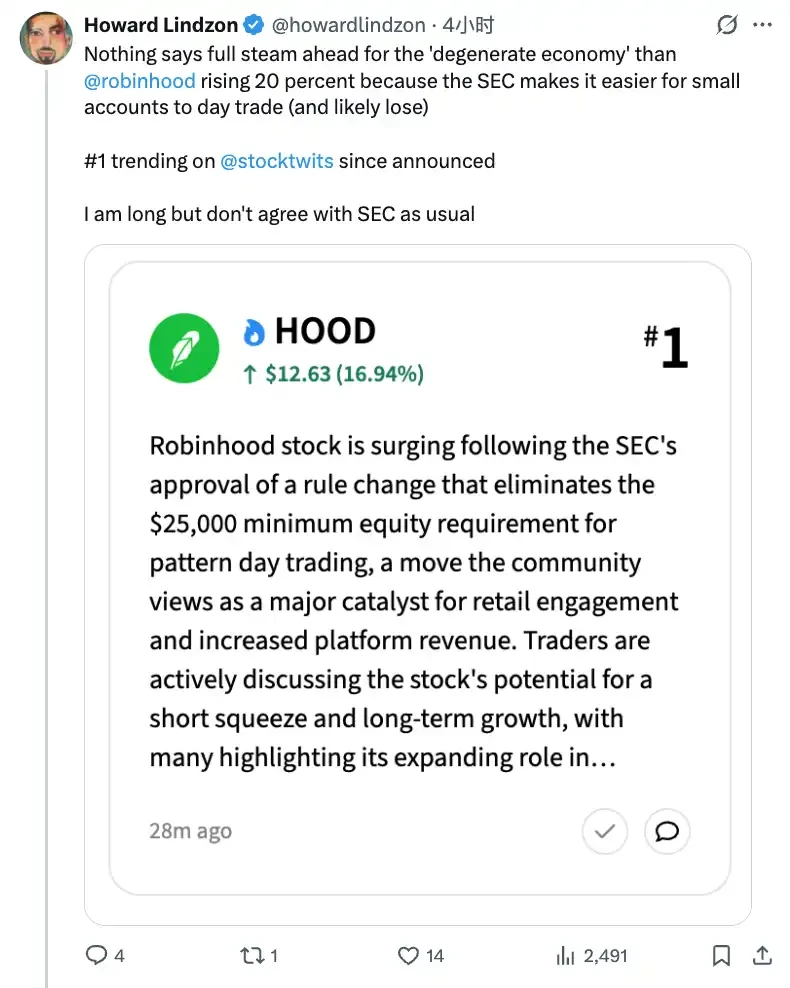 2008 年,一个叫 Howard Lindzon 的金融分析师和天使投资人创建了 StockTwits。一个专门服务投资者的社交平台。他在上面引入了 $AAPL 这样的符号,用 $ 开头把股票代码变成可点击的话题标签,让散户可以围绕具体的资产讨论、跟踪市场情绪。他给这个设计起了个名字:cashtag。