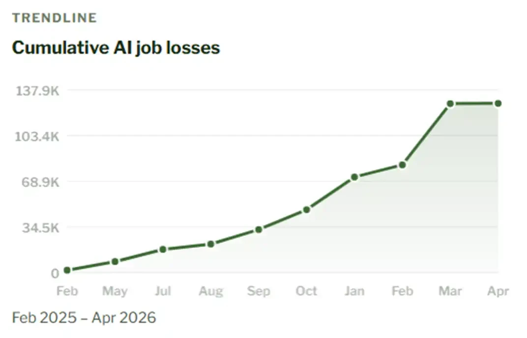 @secureainow 在上周发布了一个实时追踪美国各地因 AI 导致裁员情况的网站 jobloss.ai,该网站对从 2025 年 1 月 1 日起公开披露的、由 AI 导致的裁员案例进行了数据归集。从 2025 年 2 月至今,短短 1 年的时间,公开的 AI 导致的失业人数,已经从 1750 人上升到了 127648 人。这可能是有史以来,我们最不想看到的「快速上涨」之一: