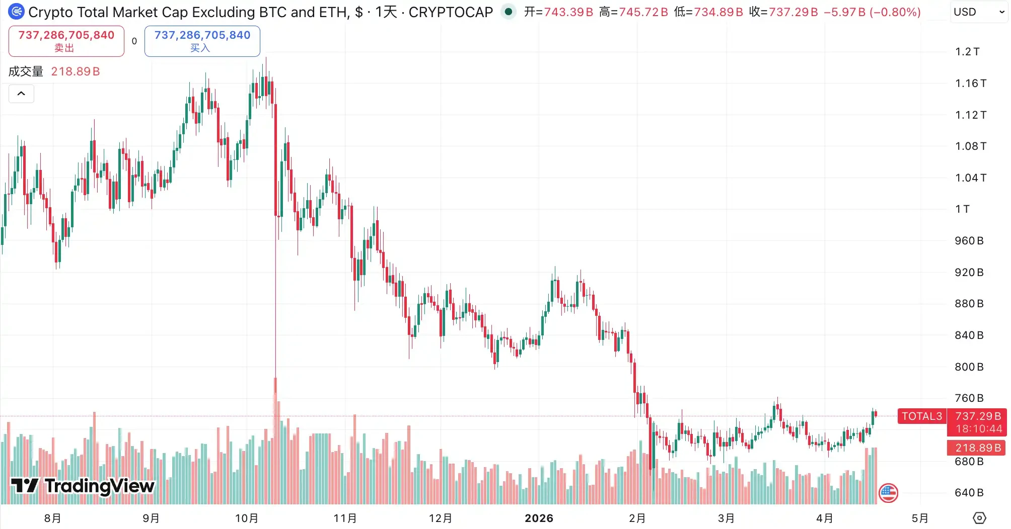从 2024 年 12 月到 2026 年 4 月,不含比特币和以太坊的山寨币总市值,从峰值约 1.16 万亿美元缩水到约 7000 亿美元,蒸发了将近 40%。市值萎缩到足够低的时候,游戏规则就变了,价格不再由市场共识决定,而是由谁掌握了足够多的筹码决定。